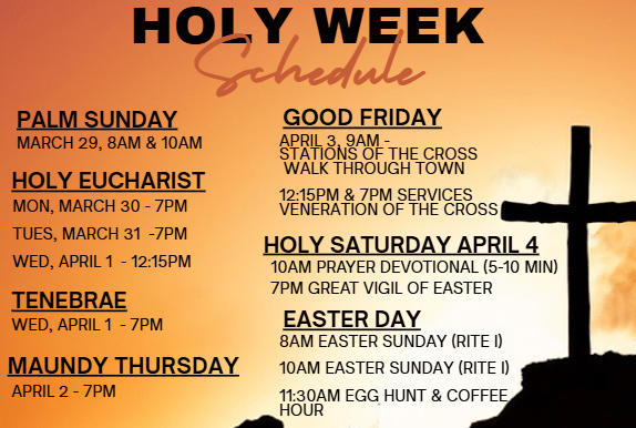 8 & 10am ServicePlease consider to attend the Coffee Hour at 11:15am followed by Egg Hunt .