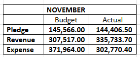 3. Expenses are below budget due to the hard work of staff and volunteers at St. Luke's, as well as as a one-time windfall tax refund of approximately $30,000. Expenses are also affected by the unevenness of certain large bills (e.g., insurance) that only come in quarterly or annually.